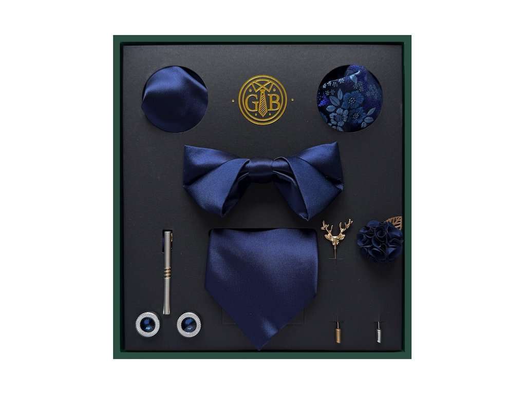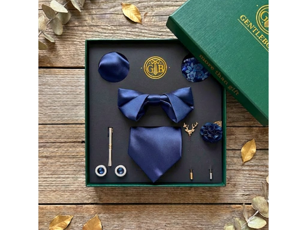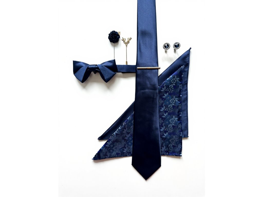 Motýlik v identickom modrom tóne dopĺňa set prirodzenou harmóniou, stabilitou a dôstojnosťou.
