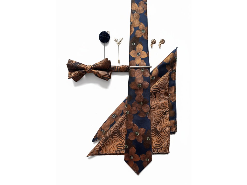 Prémiovú kravatu v modrom odtieni s medeno–oranžovým vzorom