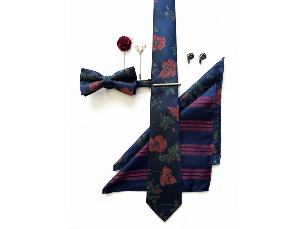 Luxusnú kravatu v tmavomodrom tóne s červenými kvetinami