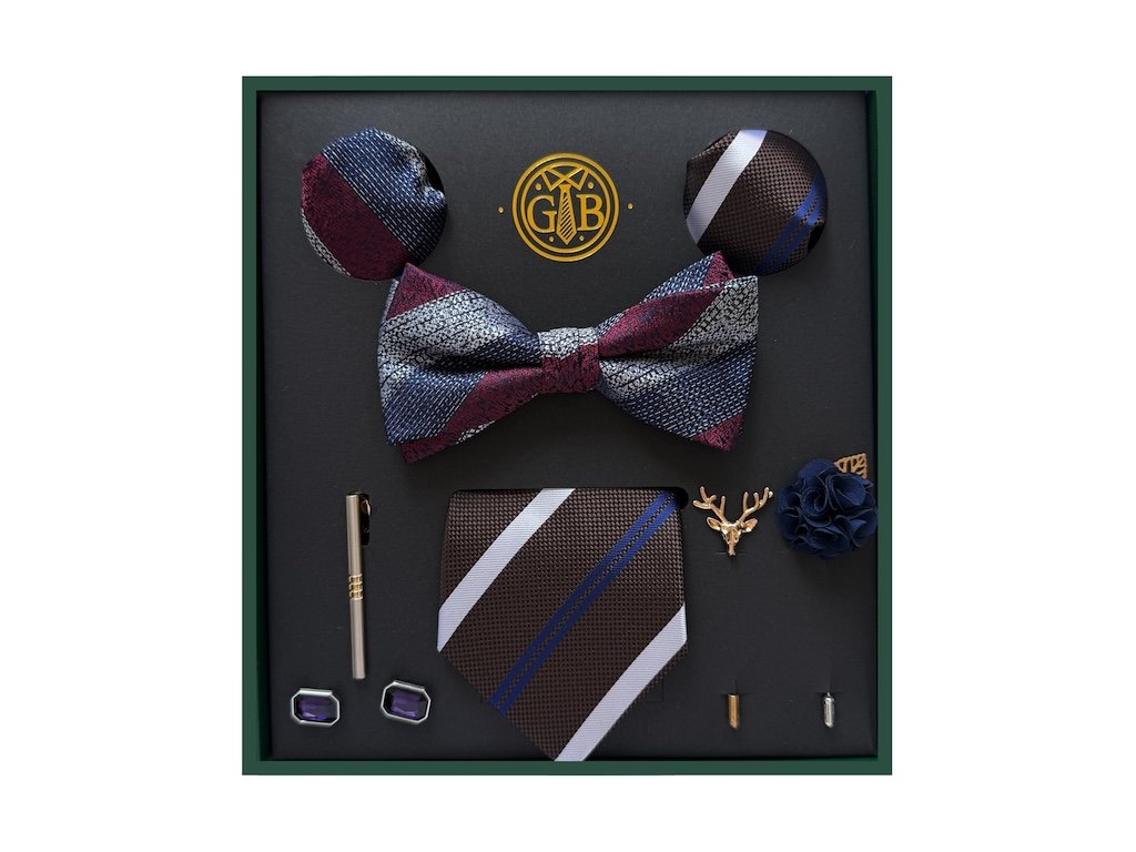 Motýlik v kombinácii modrej, bordovej a sivej so zrnitejšou štruktúrou dodáva setu moderný mestský charakter.